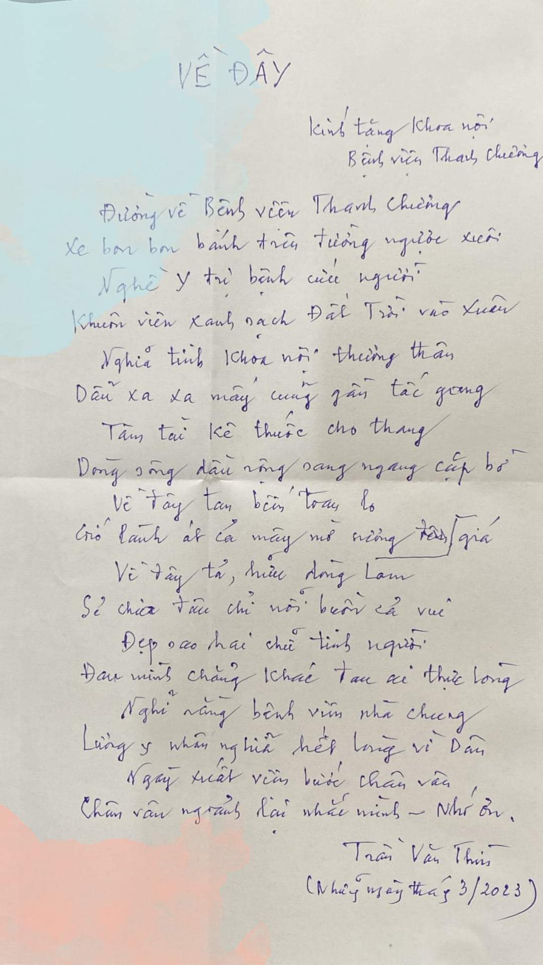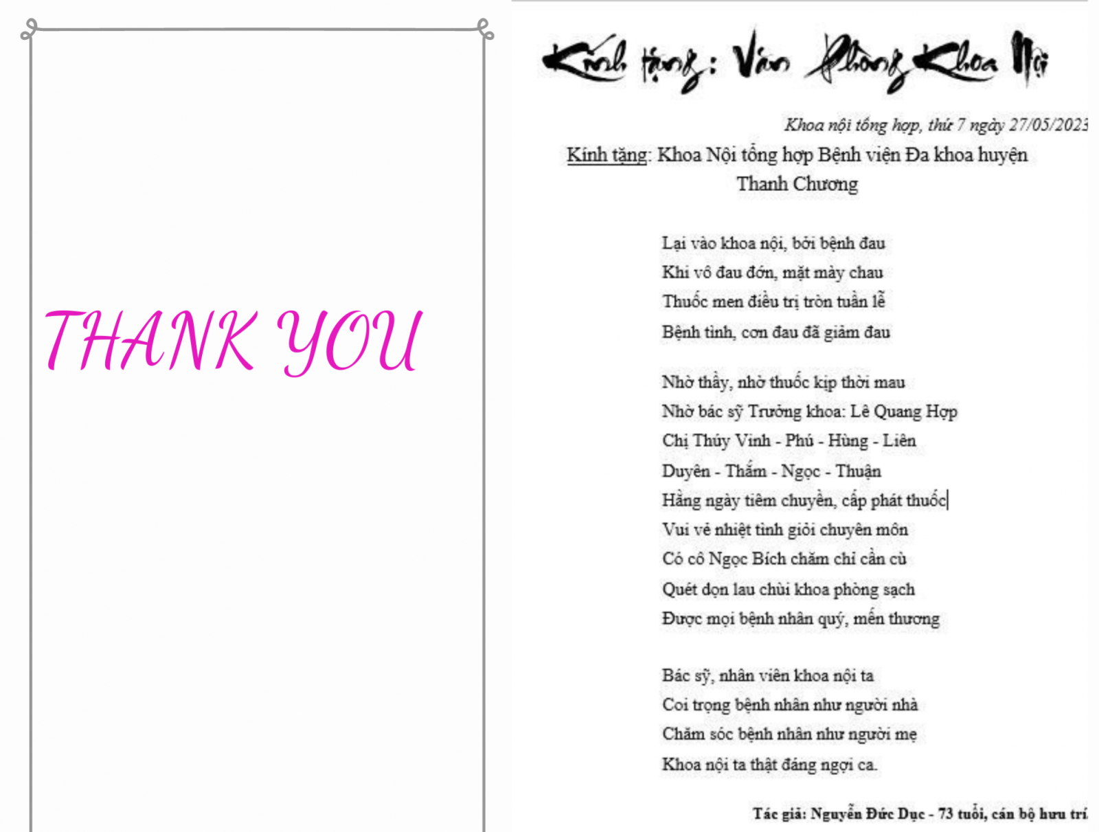 Những vần thơ mộc mạc, giản dị mà chân thành là lời cảm ơn, lời chúc của bệnh nhân dành tới bệnh viện ĐK Thanh Chương nói chung và của các khoa nói riêng. Đây chính là nguồn động viên tiếp thêm động lực giúp đội ngũ y bác sĩ BVĐK Thanh Chương tiếp tục hoàn thiện về mọi mặt nhằm mang đến những dịch vụ tốt nhất cho quý bệnh nhân khi đến thăm khám và điều trị tại bệnh viện.