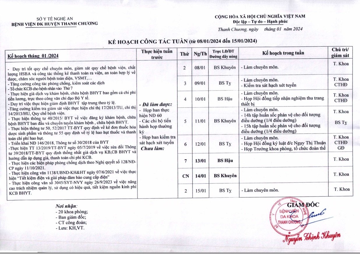 Lịch công tác tuần 2 năm 2024; từ ngày 08/01/2024 đến ngày 15/01/2024
