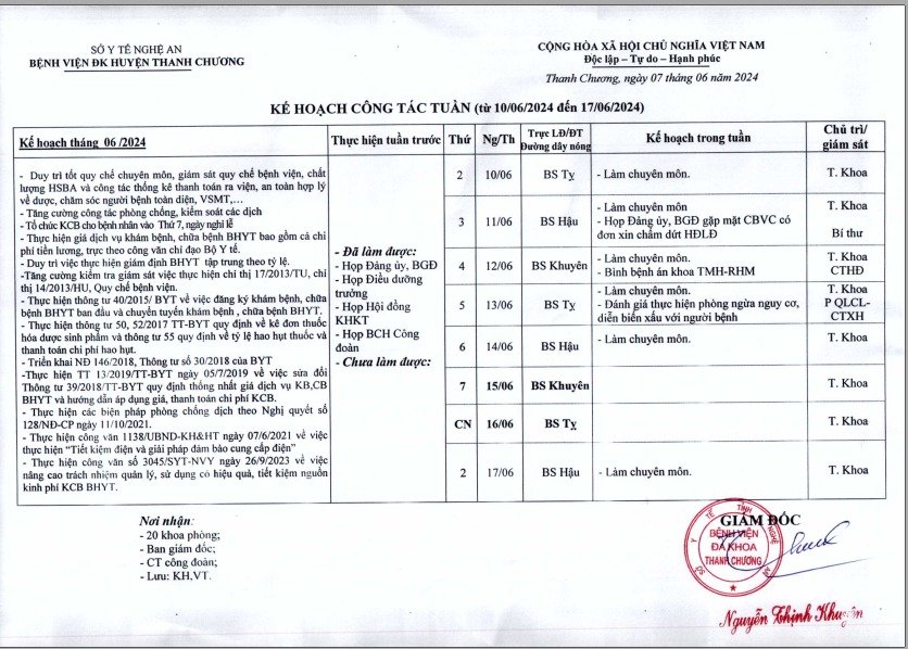 Lịch công tác tuần bệnh viện từ ngày 10-17/6/2024