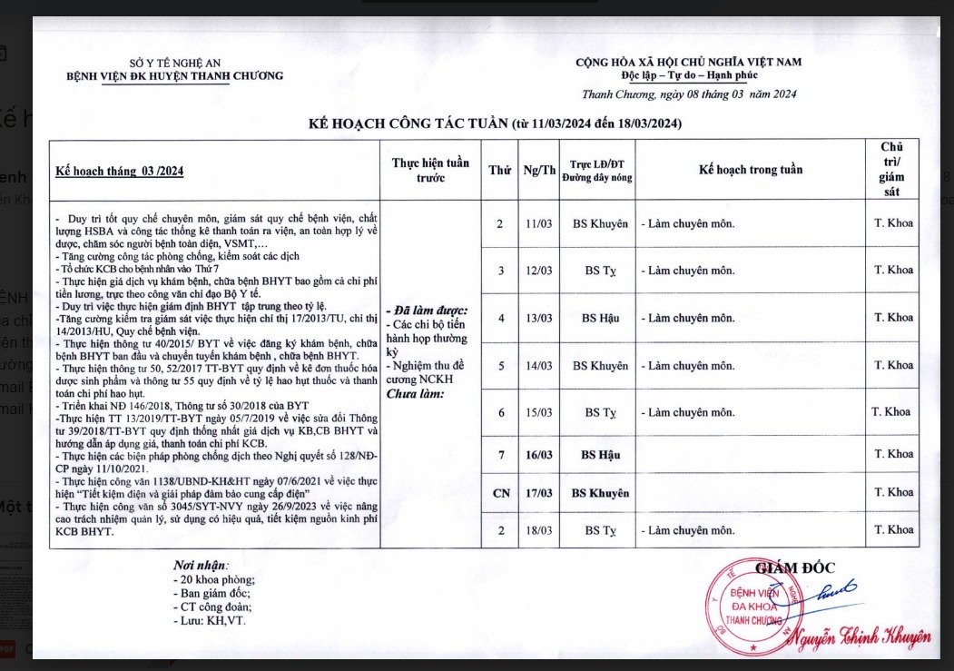 Lịch công tác tuần từ ngày 11/3/2024 đến ngày 18/3/2024