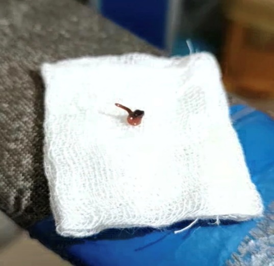 Bác sĩ sau khi thăm khám bằng nội soi Tai mũi họng đã phát hiện có con Vắt ( Đỉa rừng) sống và di chuyển trong khe mũi xoang, màu sắc giống với niêm mạc mũi, hốc mũi phù nề có điểm chảy máu rỉ rả. Kíp thủ thuật đã nhanh chóng gây tê, tiến hành gắp được nguyên vẹn 1 con Vắt ( Đỉa rừng) dài 3 cm trong mũi bệnh nhân, sau đó bơm rửa, vệ sinh sạch sẽ khoang mũi tránh biến chứng viêm nhiễm sau này. Không có khó khăn trong quá trình lấy bỏ, có chảy máu mũi tại chỗ giác bám của con vắt sau đó tự cầm máu. Không có bất thường khác được tìm thấy trong hốc mũi.